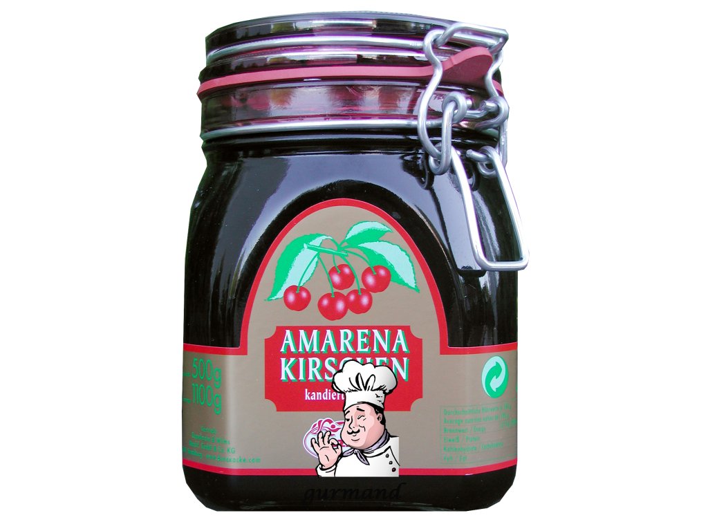 Kandované amarena třešně ve sladkém sirupu. Skladujte v chladu a suchu, po otevření skladujte v lednici.